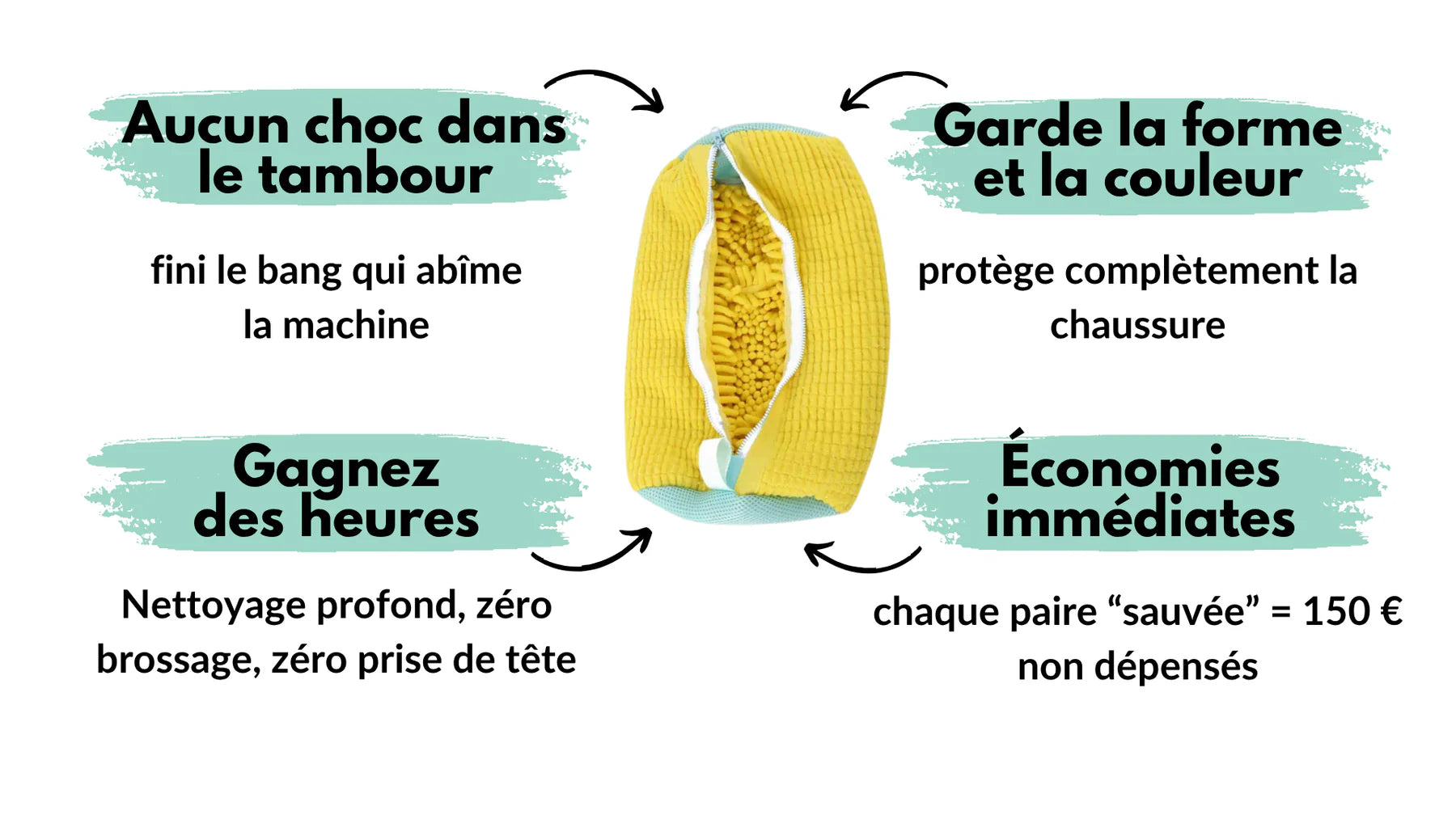 Frotter à la main, utiliser des produits chimiques agressifs ou mettre des chaussures sans protection dans la machine à laver est inefficace. Les taches restent incrustées, les chaussures se déforment et même votre machine peut être endommagée.